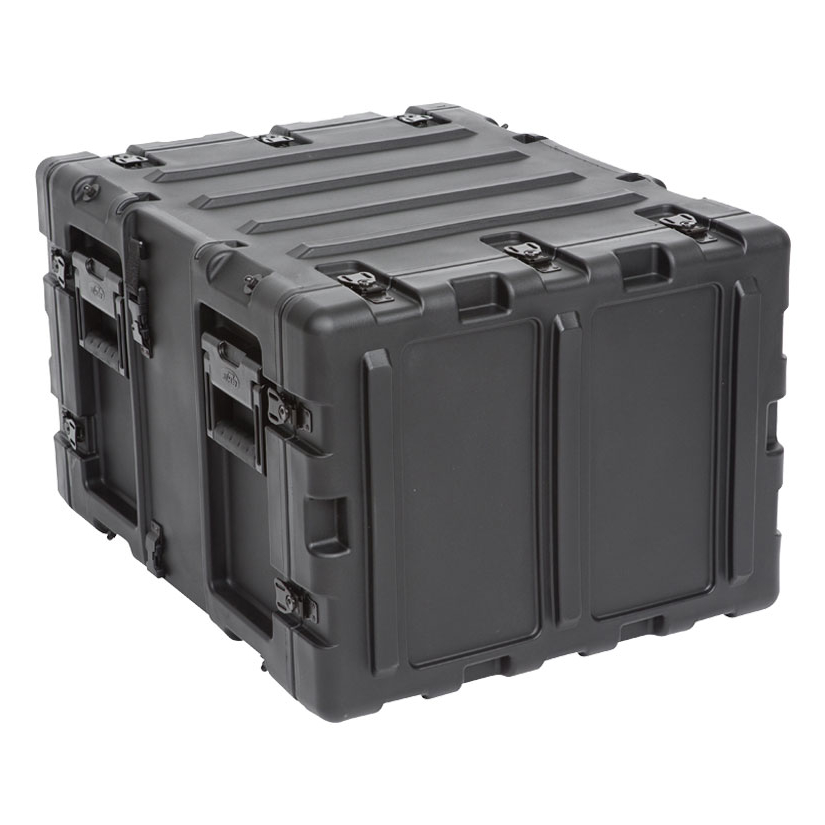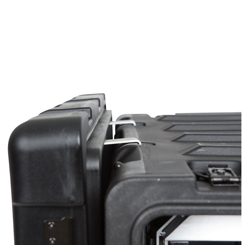 The rugged roto-molded shell ensures industry leading strength and impact resistance. The standard commercial off the shelf (COTS) case comes with 2 in. deep front and rear lids to accommodate rack gear that is longer than 20 inches. Molded-in stacking ribs and lugs are designed to stack with all SKB 3RR and 3RS cases, as well as competitive manufacturer cases, and feature black powder coated stainless steel hardware that is recessed for protection and 4 comfort grip spring loaded lift handles which allow for easy movement. An automatic pressure relief valve is another standard feature along with gasket sealed lids that include convenient lid hangers to store your lids when your equipment is in operation. Coupling straps are included for securing the racks together when stacked.